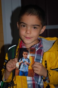 Doodles the Second Grader (holding a picture of Doodles the First Grader holding a picture of Doodles the Kindergartner)